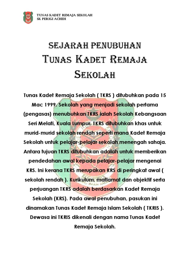 . Sekolah yang menjadi sekolah pertama perintis menubuhkan TKRS. KUIZ TUNAS KADET REMAJA SEKOLAH. Web Pertandingan buku skrap mini anjuran tunas kadet remaja sekolah hari.